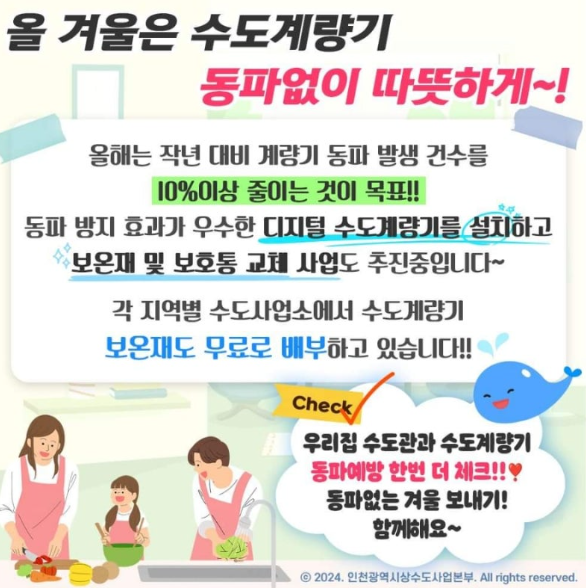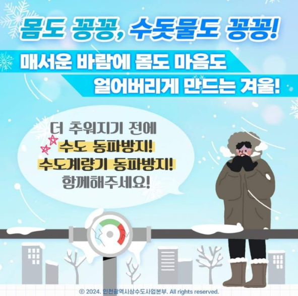 인천 지역에서 겨울철 수도개량기 동파를 예방하고, 동파 발생 시 신속하게 신고하는 방법을 안내해 드리겠습니다.