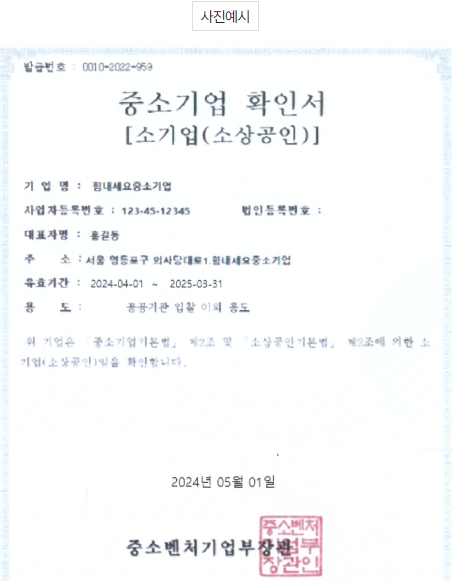 | 중소기업확인서 | ![]() 중소기업확인서 발급 (중소기업현황정보시스템 (mss.go.kr) |
