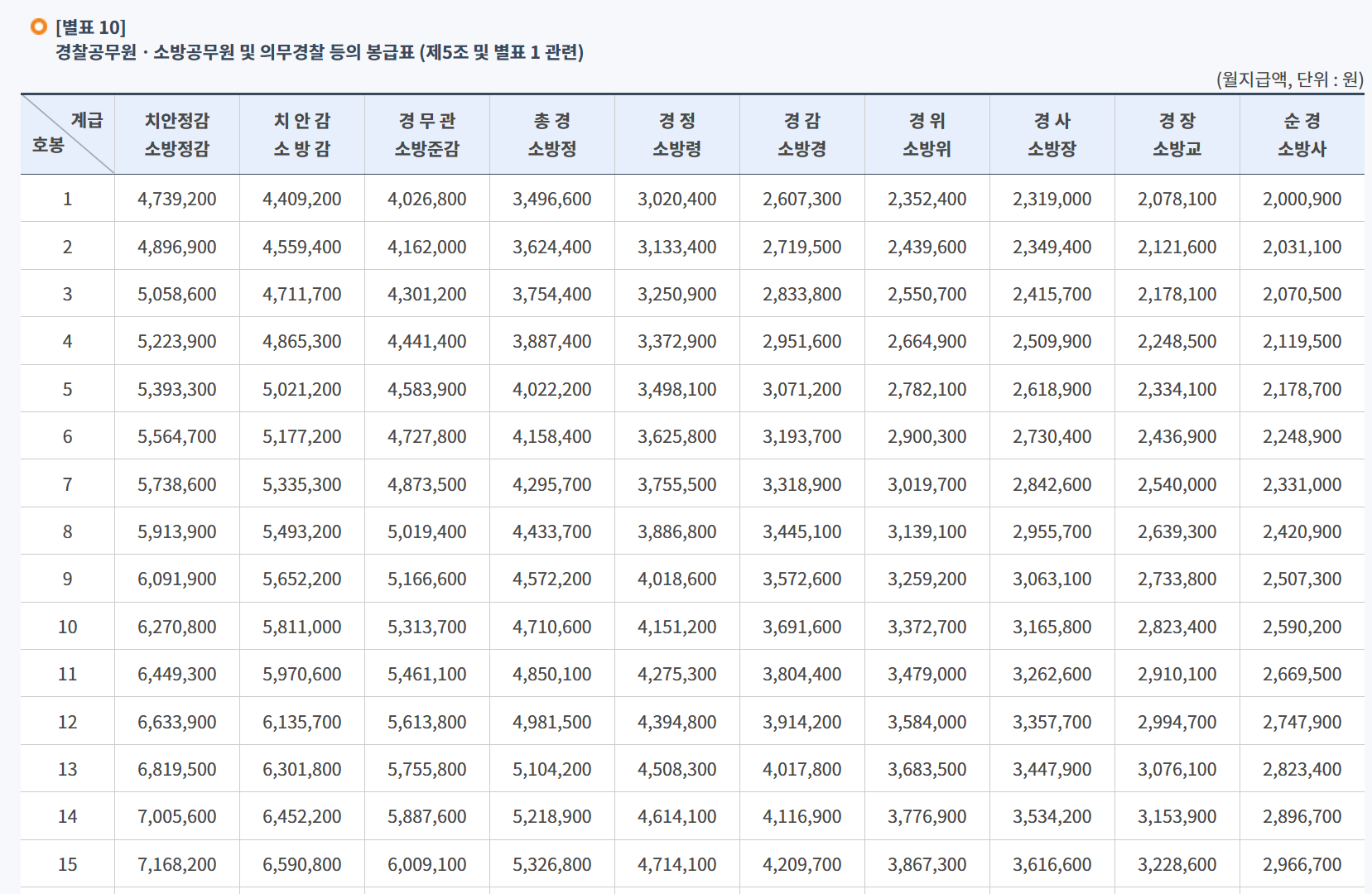경찰 공무원과 소방공무원의 봉급은 일반 공무원 봉급표와 유사하게 인상되었습니다. 순경 및 소방사 1호봉의 월 기본급은 2,000,900원으로, 이는 전년 대비 6.6% 인상된 금액입니다.