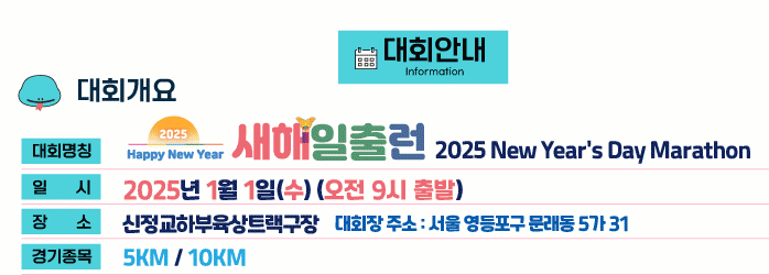 - 대회 당일에는 충분한 스트레칭과 워밍업으로 몸을 풀어주세요 새해 첫날을 활기차게 시작하고 건강과 체력을 기르며 새로운 목표를 설정할 수 있는 의미 있는 대회가 될 것 같습니다. 준비를 잘하셔서 활기찬 새해를 맞이해 보시기 바랍니다.