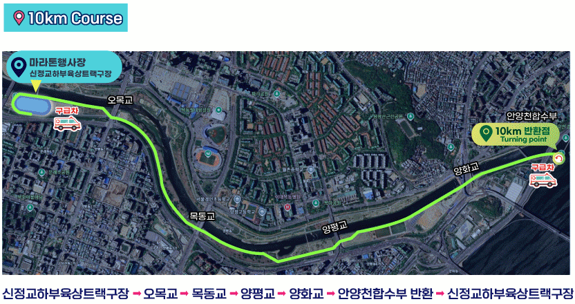 - 10km 코스 : 신정교에서 한강과 안양천 합수부까지 왕복